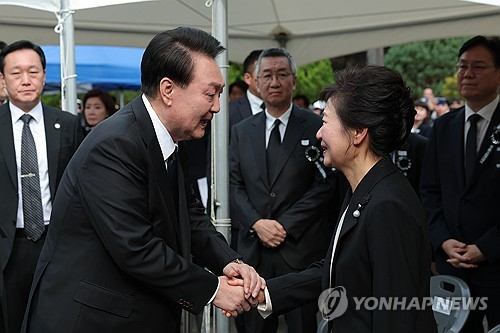 추도식장에 도착한 윤 대통령은 먼저 있던 박근혜 전 대통령에게 제일 먼저 인사하며 안부를 물었다고 이도운 대변인이 전했다. 윤 대통령이 박근혜 전 대통령 손을 두 손으로 감싸 쥐며 웃는 모습도 보였다.