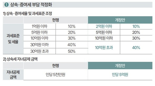 최고세율을 50%에서 40%로 10%포인트 떨어뜨리고, 과표도 구간별 세부담을 줄이는 쪽으로 조정한다. 무엇보다 자녀공제를 1인당 5천만원에서 5억원으로 대폭 높인다. 일괄공제(5억원)와 배우자공제(5억~30억원)는 조정하지 않는다.
